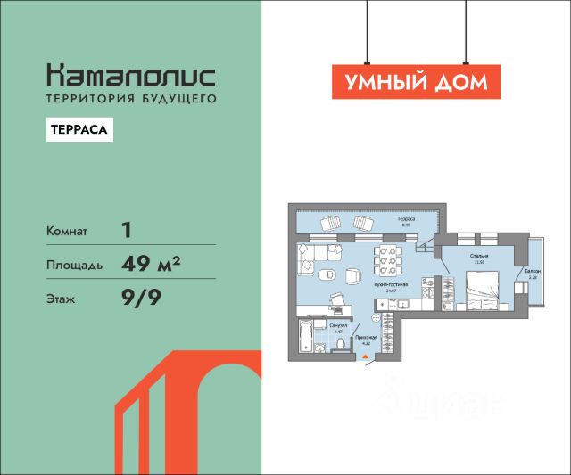 В новом жилом комплексе комфорт+ класса "Камаполис", расположенном на берегу реки Камы, продается 1-комнатная квартира площадью 44.00 кв. м. Квартира находится в 5 (1 этап) доме. Девелопер проекта - "Железно". Транспортная доступность • Трамвайная остановка всего в 3 минутах пешком; • 15 минут ходьбы до вокзала Пермь-2; • 10 минут на машине до центра города. Продуманный архитектурный проект Камаполис - это жизнь в соразмерной среде, спроектированной известными архитекторами. Жилые этажи "Камаполиса" строят из кирпича и по монолитной технологии, стены обладают высокой устойчивостью к нагрузкам, огнестойкостью, хорошей шумоизоляцией. Такие дома отлично сохраняют первоначальный внешний вид и радуют жителей долгие годы. Концептуальные лобби Концепция проекта продолжается интерьером лобби. Здесь преобладают естественные оттенки и текстуры, а мебель выполнена из экологичных материалов. Для удобства жителей созданы собственные колясочные и велосипедные, а для заботы о домашних любимцах предусмотрена лапомойка. Благоустройство Новый центр притяжения - всесезонный сквер, выполненный в тематике и стилистике пермского периода. Прогулочные зоны, игровые и спортивные площадки, релакс-зоны и места для творчества - все эти мультифункциональные пространства формируют сценарии для любого досуга. Любители особой приватности оценят соседские террасы - это специальные пространства для жителей, расположенные прямо на стилобате паркинга. Любуйтесь на реку, принимайте участие в совместных мероприятиях с соседями, с удовольствием работайте на свежем воздухе и приятно проводите время с близкими. Дополнительные преимущества • Собственный детский сад на 320 мест; • Стрит-ритейл с магазинами и кафе прямо на территории комплекса; • Управление домом через собственное мобильное приложение "Мажордом"; • 3 разных вида отделки на выбор покупателей.