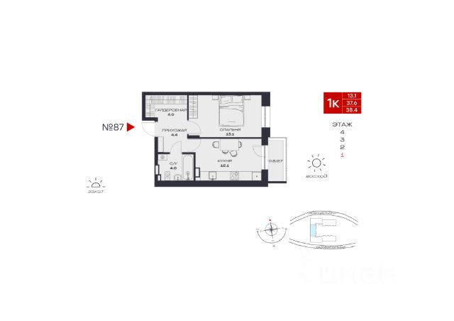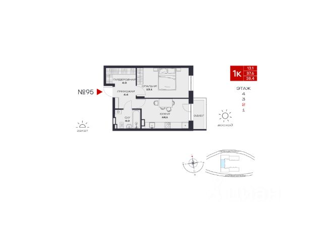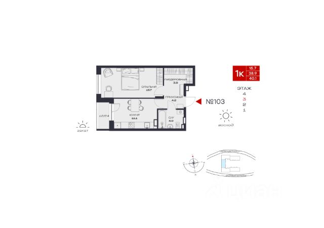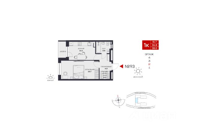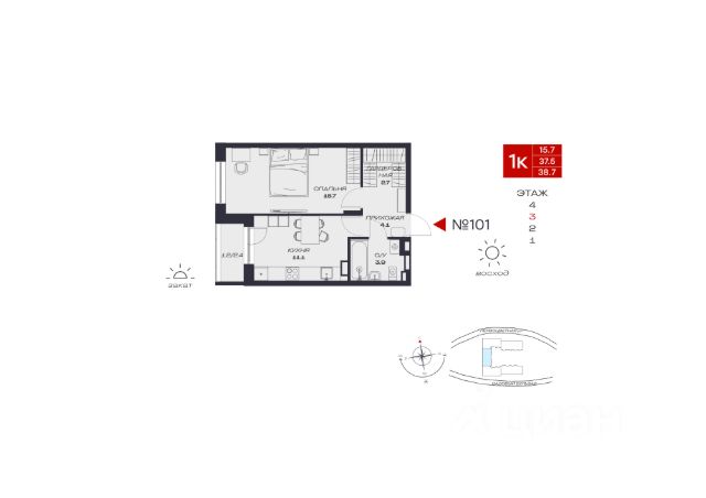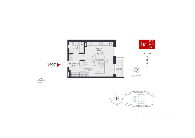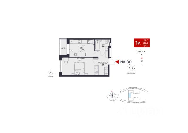 В продаже однокомнатная квартира в евроформате расположена на третьем этаже современного четырехэтажного дома с лифтом, срок сдачи — четвертый квартал 2025 года.