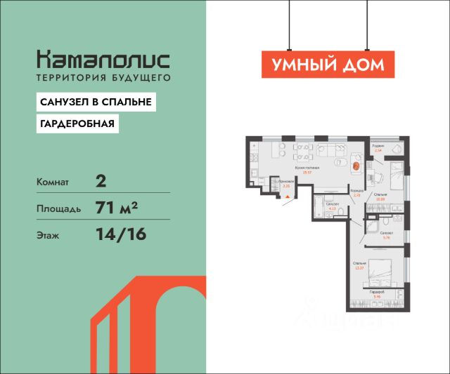 В новом жилом комплексе комфорт+ класса "Камаполис", расположенном на берегу реки Камы, продается 2-комнатная квартира площадью 70.00 кв. м. Квартира находится в 5 (1 этап) доме. Девелопер проекта - "Железно". Транспортная доступность • Трамвайная остановка всего в 3 минутах пешком; • 15 минут ходьбы до вокзала Пермь-2; • 10 минут на машине до центра города. Продуманный архитектурный проект Камаполис - это жизнь в соразмерной среде, спроектированной известными архитекторами. Жилые этажи "Камаполиса" строят из кирпича и по монолитной технологии, стены обладают высокой устойчивостью к нагрузкам, огнестойкостью, хорошей шумоизоляцией. Такие дома отлично сохраняют первоначальный внешний вид и радуют жителей долгие годы. Концептуальные лобби Концепция проекта продолжается интерьером лобби. Здесь преобладают естественные оттенки и текстуры, а мебель выполнена из экологичных материалов. Для удобства жителей созданы собственные колясочные и велосипедные, а для заботы о домашних любимцах предусмотрена лапомойка. Благоустройство Новый центр притяжения - всесезонный сквер, выполненный в тематике и стилистике пермского периода. Прогулочные зоны, игровые и спортивные площадки, релакс-зоны и места для творчества - все эти мультифункциональные пространства формируют сценарии для любого досуга. Любители особой приватности оценят соседские террасы - это специальные пространства для жителей, расположенные прямо на стилобате паркинга. Любуйтесь на реку, принимайте участие в совместных мероприятиях с соседями, с удовольствием работайте на свежем воздухе и приятно проводите время с близкими. Дополнительные преимущества • Собственный детский сад на 320 мест; • Стрит-ритейл с магазинами и кафе прямо на территории комплекса; • Управление домом через собственное мобильное приложение "Мажордом"; • 3 разных вида отделки на выбор покупателей.