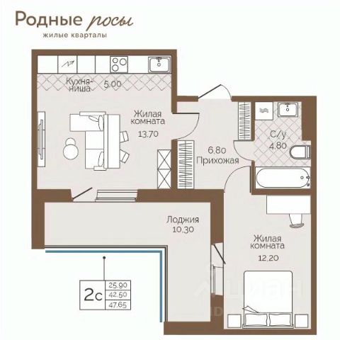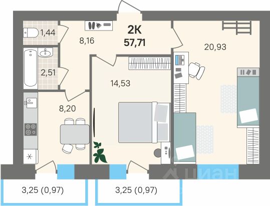 Квартира с кухней-гостиной и двумя спальнями в квартале "Юность". Особенности планировки: балкон, разнесённые спальни.