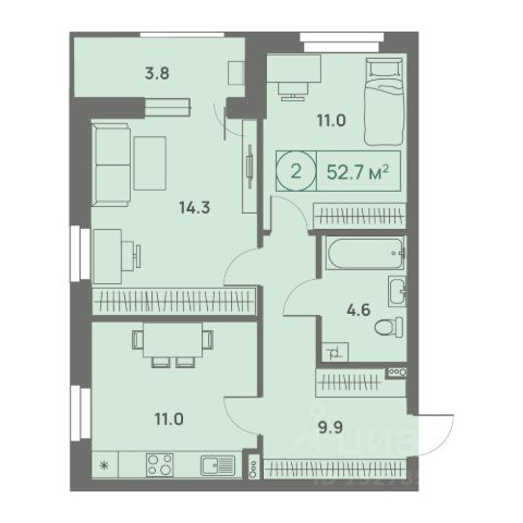 Квартира имеет две изолированные комнаты (16,2- 14,4);