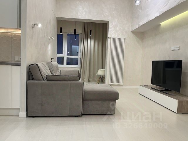 Квартира состоит из гостиной с кухней, коридора, санузла, гардеробной и лоджии с потрясающим видом на Комсомольскую площадь.