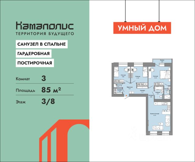 В новом жилом комплексе комфорт+ класса "Камаполис", расположенном на берегу реки Камы, продается 3-комнатная квартира площадью 85.00 кв. м. Квартира находится в 4 доме. Девелопер проекта - "Железно". Транспортная доступность • Трамвайная остановка всего в 3 минутах пешком; • 15 минут ходьбы до вокзала Пермь-2; • 10 минут на машине до центра города. Продуманный архитектурный проект Камаполис - это жизнь в соразмерной среде, спроектированной известными архитекторами. Жилые этажи "Камаполиса" строят из кирпича и по монолитной технологии, стены обладают высокой устойчивостью к нагрузкам, огнестойкостью, хорошей шумоизоляцией. Такие дома отлично сохраняют первоначальный внешний вид и радуют жителей долгие годы. Концептуальные лобби Концепция проекта продолжается интерьером лобби. Здесь преобладают естественные оттенки и текстуры, а мебель выполнена из экологичных материалов. Для удобства жителей созданы собственные колясочные и велосипедные, а для заботы о домашних любимцах предусмотрена лапомойка. Благоустройство Новый центр притяжения - всесезонный сквер, выполненный в тематике и стилистике пермского периода. Прогулочные зоны, игровые и спортивные площадки, релакс-зоны и места для творчества - все эти мультифункциональные пространства формируют сценарии для любого досуга. Любители особой приватности оценят соседские террасы - это специальные пространства для жителей, расположенные прямо на стилобате паркинга. Любуйтесь на реку, принимайте участие в совместных мероприятиях с соседями, с удовольствием работайте на свежем воздухе и приятно проводите время с близкими. Дополнительные преимущества • Собственный детский сад на 320 мест; • Стрит-ритейл с магазинами и кафе прямо на территории комплекса; • Управление домом через собственное мобильное приложение "Мажордом"; • 3 разных вида отделки на выбор покупателей.