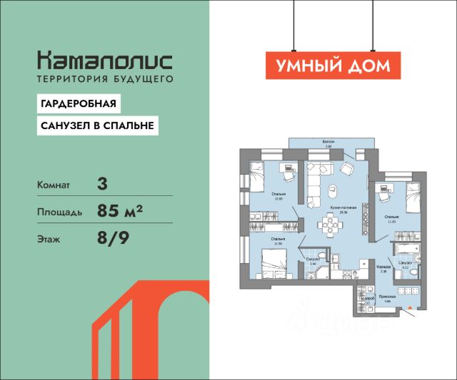 В новом жилом комплексе комфорт+ класса "Камаполис", расположенном на берегу реки Камы, продается 3-комнатная квартира площадью 88.00 кв. м. с предчистовой отделкой. Квартира находится в 3 доме. Девелопер проекта - "Железно". Транспортная доступность • Трамвайная остановка всего в 3 минутах пешком; • 15 минут ходьбы до вокзала Пермь-2; • 10 минут на машине до центра города. Продуманный архитектурный проект Камаполис - это жизнь в соразмерной среде, спроектированной известными архитекторами. Жилые этажи "Камаполиса" строят из кирпича и по монолитной технологии, стены обладают высокой устойчивостью к нагрузкам, огнестойкостью, хорошей шумоизоляцией. Такие дома отлично сохраняют первоначальный внешний вид и радуют жителей долгие годы. Концептуальные лобби Концепция проекта продолжается интерьером лобби. Здесь преобладают естественные оттенки и текстуры, а мебель выполнена из экологичных материалов. Для удобства жителей созданы собственные колясочные и велосипедные, а для заботы о домашних любимцах предусмотрена лапомойка. Благоустройство Новый центр притяжения - всесезонный сквер, выполненный в тематике и стилистике пермского периода. Прогулочные зоны, игровые и спортивные площадки, релакс-зоны и места для творчества - все эти мультифункциональные пространства формируют сценарии для любого досуга. Любители особой приватности оценят соседские террасы - это специальные пространства для жителей, расположенные прямо на стилобате паркинга. Любуйтесь на реку, принимайте участие в совместных мероприятиях с соседями, с удовольствием работайте на свежем воздухе и приятно проводите время с близкими. Дополнительные преимущества • Собственный детский сад на 320 мест; • Стрит-ритейл с магазинами и кафе прямо на территории комплекса; • Управление домом через собственное мобильное приложение "Мажордом"; • 3 разных вида отделки на выбор покупателей.