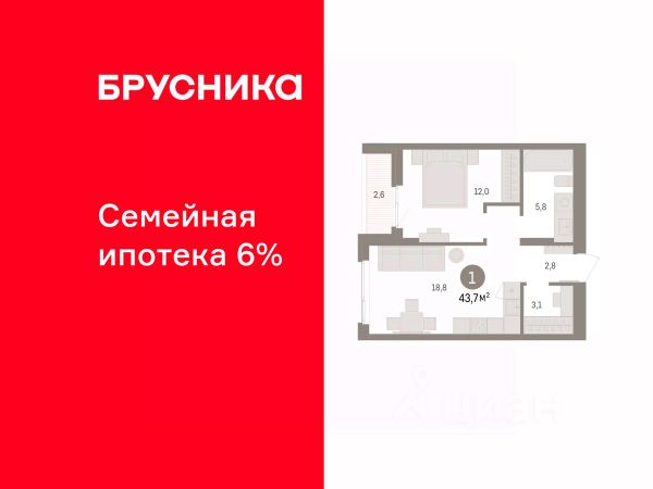 Квартира с кухней-гостиной и одной спальней в квартале "Юность". Особенности планировки: гардеробная, лоджия.