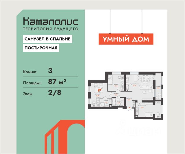 Особенность планировки - отдельное помещение для постирочной, благодаря которому чистое белье теперь не будет нарушать эстетику квартиры, и вы сможете любоваться лучшими видами с балконов и лоджий. В новом жилом комплексе комфорт+ класса "Камаполис", расположенном на берегу реки Камы, продается 3-комнатная квартира площадью 87.00 кв. м. Квартира находится в 5 (1 этап) доме. Девелопер проекта - "Железно". Транспортная доступность • Трамвайная остановка всего в 3 минутах пешком; • 15 минут ходьбы до вокзала Пермь-2; • 10 минут на машине до центра города. Продуманный архитектурный проект Камаполис - это жизнь в соразмерной среде, спроектированной известными архитекторами. Жилые этажи "Камаполиса" строят из кирпича и по монолитной технологии, стены обладают высокой устойчивостью к нагрузкам, огнестойкостью, хорошей шумоизоляцией. Такие дома отлично сохраняют первоначальный внешний вид и радуют жителей долгие годы. Концептуальные лобби Концепция проекта продолжается интерьером лобби. Здесь преобладают естественные оттенки и текстуры, а мебель выполнена из экологичных материалов. Для удобства жителей созданы собственные колясочные и велосипедные, а для заботы о домашних любимцах предусмотрена лапомойка. Благоустройство Новый центр притяжения - всесезонный сквер, выполненный в тематике и стилистике пермского периода. Прогулочные зоны, игровые и спортивные площадки, релакс-зоны и места для творчества - все эти мультифункциональные пространства формируют сценарии для любого досуга. Любители особой приватности оценят соседские террасы - это специальные пространства для жителей, расположенные прямо на стилобате паркинга. Любуйтесь на реку, принимайте участие в совместных мероприятиях с соседями, с удовольствием работайте на свежем воздухе и приятно проводите время с близкими. Дополнительные преимущества • Собственный детский сад на 320 мест; • Стрит-ритейл с магазинами и кафе прямо на территории комплекса; • Управление домом через собственное мобильное приложение "Мажордом"; • 3 разных вида отделки на выбор покупателей. Купить 3-комнатную квартиру в новостройке с большой кухней в Пермском крае.