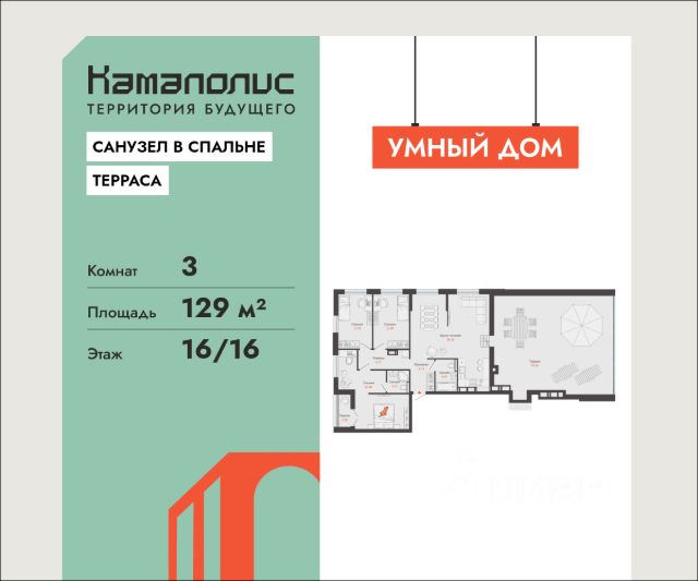 Особенность планировки - собственная терраса, ощутите преимущества загородного отдыха и полного единения с окружающей Вас красотой с видом на гладь воды Камы. В новом жилом комплексе комфорт+ класса "Камаполис", расположенном на берегу реки Камы, продается 3-комнатная квартира площадью 129.00 кв. м. Квартира находится в 5 (1 этап) доме. Девелопер проекта - "Железно". Транспортная доступность • Трамвайная остановка всего в 3 минутах пешком; • 15 минут ходьбы до вокзала Пермь-2; • 10 минут на машине до центра города. Продуманный архитектурный проект Камаполис - это жизнь в соразмерной среде, спроектированной известными архитекторами. Жилые этажи "Камаполиса" строят из кирпича и по монолитной технологии, стены обладают высокой устойчивостью к нагрузкам, огнестойкостью, хорошей шумоизоляцией. Такие дома отлично сохраняют первоначальный внешний вид и радуют жителей долгие годы. Концептуальные лобби Концепция проекта продолжается интерьером лобби. Здесь преобладают естественные оттенки и текстуры, а мебель выполнена из экологичных материалов. Для удобства жителей созданы собственные колясочные и велосипедные, а для заботы о домашних любимцах предусмотрена лапомойка. Благоустройство Новый центр притяжения - всесезонный сквер, выполненный в тематике и стилистике пермского периода. Прогулочные зоны, игровые и спортивные площадки, релакс-зоны и места для творчества - все эти мультифункциональные пространства формируют сценарии для любого досуга. Любители особой приватности оценят соседские террасы - это специальные пространства для жителей, расположенные прямо на стилобате паркинга. Любуйтесь на реку, принимайте участие в совместных мероприятиях с соседями, с удовольствием работайте на свежем воздухе и приятно проводите время с близкими. Дополнительные преимущества • Собственный детский сад на 320 мест; • Стрит-ритейл с магазинами и кафе прямо на территории комплекса; • Управление домом через собственное мобильное приложение "Мажордом"; • 3 разных вида отделки на выбор покупателей.