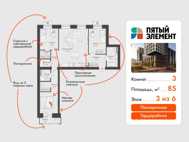 Продается 3-комнатная квартира в развитом районе Перми, площадью 87.00 кв. м. Квартира находится в новом жилом комплексе "Пятый Элемент" от федерального застройщика "Железно". Проект "Пятый Элемент" - это полноценный город в городе, где в пределах 15 минут есть всё для комфортной жизни. Хорошая транспортная доступность, близость к центру, собственная инфраструктура и настоящая атмосфера добрососедства объединились в один жилой комплекс, жизнь в котором течёт легко, свежо и с улыбкой. Каждый дом уникален: переменная высотность обеспечивает хорошую инсоляцию во дворах и квартирах, оригинально оформленные фасады с продуманными декоративными деталями не только притягивают взгляды, а также обеспечивают жителей теплом и тишиной. Никаких однотипных коробок и повторяющихся окон - только красивые виды и разнообразные планировки. Внутренний двор - это пространство, созданное с заботой о каждом возрасте. Именно поэтому территория комплекса "Пятый Элемент" разделена на несколько тематических зон, чтобы дети развлекались в ярких песочницах, подростки играли в футбол или занимались на турниках, а родители и пожилые жители могли отдохнуть под уютным навесом в тихой обстановке. Преимущества: - Собственная сервисная компания "Азбука"; - Технология будущего "Умный дом"; - Уютные лобби с дизайнерским оформлением; - Школа, детский сад, паркинг и другая инфраструктура в шаговой доступности. Успейте приобрести квартиру на выгодных условиях! Чтобы узнать подробности, обращайтесь за консультацией по телефону. 3-комнатной квартиры в ЖК с большой кухней-гостиной в Пермском крае.