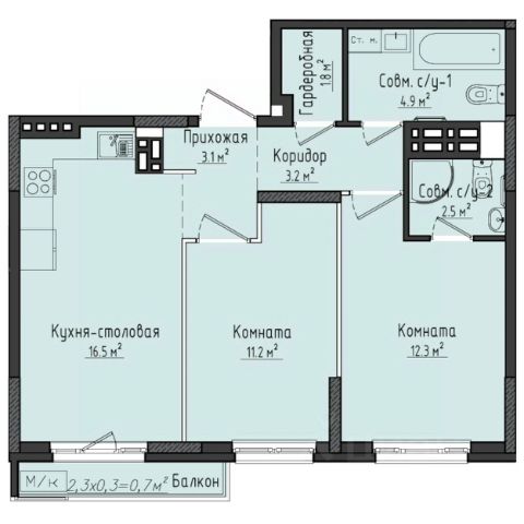 Просторная евро-планировка с окнами на две стороны света — идеальное решение для семьи, ценящей свет и пространство. Площадь 54,3 кв.м. с двумя спальнями, двумя санузлами, кухней-гостиной и продуманным зонированием. Потолки 2,7 м. Объединенная кухня-гостиная 16,3 кв.м. — пространство для готовки, общения и семейных ужинов за общим столом. Две отдельные спальни обеспечивают комфорт и личное пространство. Два санузла, один из которых оснащен зоной под стиральную машину. Лоджия — дополнение к жилому пространству: для отдыха или сезонного хранения. Планировка, в которой приятно проводить время с семьей.