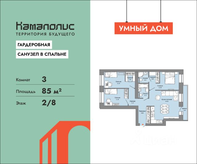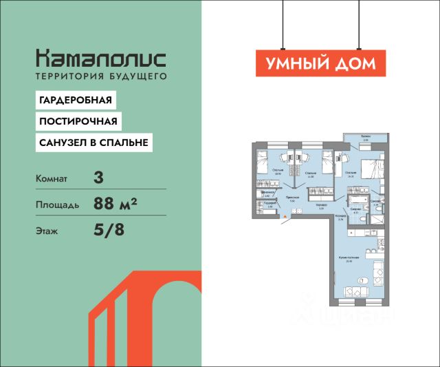 В новом жилом комплексе комфорт+ класса "Камаполис", расположенном на берегу реки Камы, продается 3-комнатная квартира площадью 88.00 кв. м. с предчистовой отделкой. Квартира находится в 3 доме. Девелопер проекта - "Железно". Транспортная доступность • Трамвайная остановка всего в 3 минутах пешком; • 15 минут ходьбы до вокзала Пермь-2; • 10 минут на машине до центра города. Продуманный архитектурный проект Камаполис - это жизнь в соразмерной среде, спроектированной известными архитекторами. Жилые этажи "Камаполиса" строят из кирпича и по монолитной технологии, стены обладают высокой устойчивостью к нагрузкам, огнестойкостью, хорошей шумоизоляцией. Такие дома отлично сохраняют первоначальный внешний вид и радуют жителей долгие годы. Концептуальные лобби Концепция проекта продолжается интерьером лобби. Здесь преобладают естественные оттенки и текстуры, а мебель выполнена из экологичных материалов. Для удобства жителей созданы собственные колясочные и велосипедные, а для заботы о домашних любимцах предусмотрена лапомойка. Благоустройство Новый центр притяжения - всесезонный сквер, выполненный в тематике и стилистике пермского периода. Прогулочные зоны, игровые и спортивные площадки, релакс-зоны и места для творчества - все эти мультифункциональные пространства формируют сценарии для любого досуга. Любители особой приватности оценят соседские террасы - это специальные пространства для жителей, расположенные прямо на стилобате паркинга. Любуйтесь на реку, принимайте участие в совместных мероприятиях с соседями, с удовольствием работайте на свежем воздухе и приятно проводите время с близкими. Дополнительные преимущества • Собственный детский сад на 320 мест; • Стрит-ритейл с магазинами и кафе прямо на территории комплекса; • Управление домом через собственное мобильное приложение "Мажордом"; • 3 разных вида отделки на выбор покупателей.