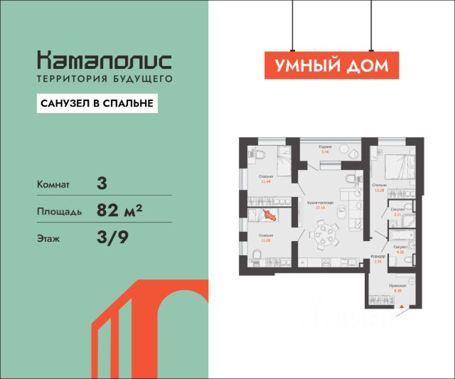 Особенность планировки - отдельное помещение для постирочной, благодаря которому чистое белье теперь не будет нарушать эстетику квартиры, и вы сможете любоваться лучшими видами с балконов и лоджий. В новом жилом комплексе комфорт+ класса "Камаполис", расположенном на берегу реки Камы, продается 3-комнатная квартира площадью 87.00 кв. м. Квартира находится в 5 (1 этап) доме. Девелопер проекта - "Железно". Транспортная доступность • Трамвайная остановка всего в 3 минутах пешком; • 15 минут ходьбы до вокзала Пермь-2; • 10 минут на машине до центра города. Продуманный архитектурный проект Камаполис - это жизнь в соразмерной среде, спроектированной известными архитекторами. Жилые этажи "Камаполиса" строят из кирпича и по монолитной технологии, стены обладают высокой устойчивостью к нагрузкам, огнестойкостью, хорошей шумоизоляцией. Такие дома отлично сохраняют первоначальный внешний вид и радуют жителей долгие годы. Концептуальные лобби Концепция проекта продолжается интерьером лобби. Здесь преобладают естественные оттенки и текстуры, а мебель выполнена из экологичных материалов. Для удобства жителей созданы собственные колясочные и велосипедные, а для заботы о домашних любимцах предусмотрена лапомойка. Благоустройство Новый центр притяжения - всесезонный сквер, выполненный в тематике и стилистике пермского периода. Прогулочные зоны, игровые и спортивные площадки, релакс-зоны и места для творчества - все эти мультифункциональные пространства формируют сценарии для любого досуга. Любители особой приватности оценят соседские террасы - это специальные пространства для жителей, расположенные прямо на стилобате паркинга. Любуйтесь на реку, принимайте участие в совместных мероприятиях с соседями, с удовольствием работайте на свежем воздухе и приятно проводите время с близкими. Дополнительные преимущества • Собственный детский сад на 320 мест; • Стрит-ритейл с магазинами и кафе прямо на территории комплекса; • Управление домом через собственное мобильное приложение "Мажордом"; • 3 разных вида отделки на выбор покупателей.