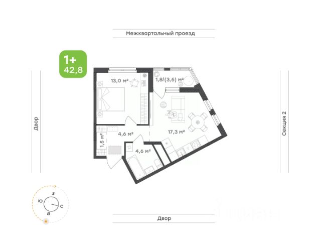 Евро-формат с продуманной планировкой — пространство для тех, кто живет один или в паре. Площадь 42,6 кв.м. с совмещенной кухней-гостиной, обособленной спальней, личной гардеробной и возможностью оборудовать рабочее место. Высота потолков 3 м. Кухня-гостиная 18,4 кв.м. — пространство для готовки, отдыха и ужинов. Отдельная спальня для спокойного отдыха. Лоджия — уютное место для утреннего кофе или вечернего релакса под пение птиц. Личная гардеробная для хранения вещей. Формат для комфортной жизни с учетом всех современных потребностей.