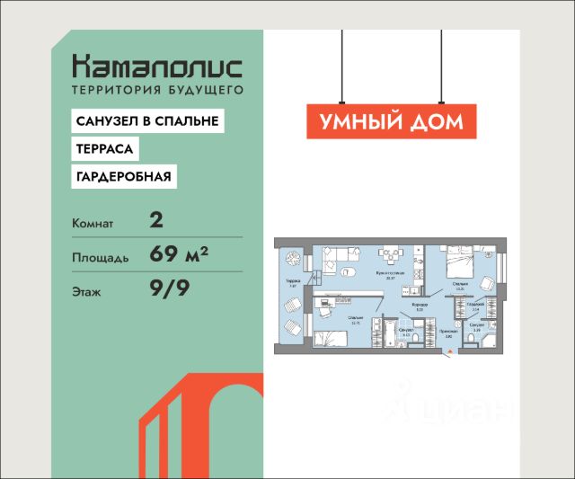 Особенность планировки - собственная терраса, ощутите преимущества загородного отдыха и полного единения с окружающей Вас красотой с видом на гладь воды Камы. В новом жилом комплексе комфорт+ класса "Камаполис", расположенном на берегу реки Камы, продается 2-комнатная квартира площадью 69.00 кв. м. Квартира находится в 4 доме. Девелопер проекта - "Железно". Транспортная доступность • Трамвайная остановка всего в 3 минутах пешком; • 15 минут ходьбы до вокзала Пермь-2; • 10 минут на машине до центра города. Продуманный архитектурный проект Камаполис - это жизнь в соразмерной среде, спроектированной известными архитекторами. Жилые этажи "Камаполиса" строят из кирпича и по монолитной технологии, стены обладают высокой устойчивостью к нагрузкам, огнестойкостью, хорошей шумоизоляцией. Такие дома отлично сохраняют первоначальный внешний вид и радуют жителей долгие годы. Концептуальные лобби Концепция проекта продолжается интерьером лобби. Здесь преобладают естественные оттенки и текстуры, а мебель выполнена из экологичных материалов. Для удобства жителей созданы собственные колясочные и велосипедные, а для заботы о домашних любимцах предусмотрена лапомойка. Благоустройство Новый центр притяжения - всесезонный сквер, выполненный в тематике и стилистике пермского периода. Прогулочные зоны, игровые и спортивные площадки, релакс-зоны и места для творчества - все эти мультифункциональные пространства формируют сценарии для любого досуга. Любители особой приватности оценят соседские террасы - это специальные пространства для жителей, расположенные прямо на стилобате паркинга. Любуйтесь на реку, принимайте участие в совместных мероприятиях с соседями, с удовольствием работайте на свежем воздухе и приятно проводите время с близкими. Дополнительные преимущества • Собственный детский сад на 320 мест; • Стрит-ритейл с магазинами и кафе прямо на территории комплекса; • Управление домом через собственное мобильное приложение "Мажордом"; • 3 разных вида отделки на выбор покупателей.