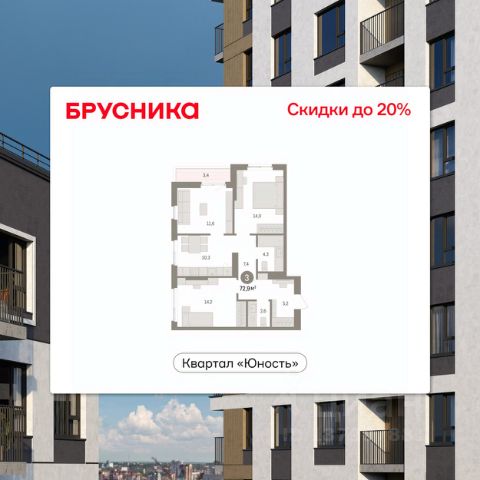 Двухкомнатная квартира от застройщика с предчистовой отделкой в ЖК "Квартал "Юность"" на 3 этаже. Общая площадь: 72.42 кв.м., жилая: 24.3 кв.м., площадь просторной кухни-гостиной: 22.3 кв.м. Угловая квартира, окна oбecпeчивaют paвнoмepнoe ocвeщeниe в тeчeниe дня. В квартире две лоджии, один совмещенный и один раздельный санузел. Высота потолков 2.7 м. Квартира находится в корпусе 1. Дом монолитный, одноподъездный, высотой 16 этажей. На этаже 8 квартир. В подъезде 1 пассажирский и 1 грузовой лифт. Окончание строительства - 4 квартал 2028 года. Оформление сделки по договору долевого участия. Квартира с кухней-гостиной и двумя спальнями в квартале "Юность". Особенности планировки: вид во двор, второй санузел, лоджия, разнесённые спальни. квартиры в нашей базе: ЮСТ01-Ж1.3.7. Квартал "Юность" расположен между улицами Лодыгина и Яблочкова. Обе названы в честь русских электротехников и изобретателей, которые занимались созданием электрических ламп. Это соседство вдохновило нас на метафору, которая легла в основу концепции проекта. В физике есть термин "суперпозиция" — наложение нескольких воздействий, приводящее к суммарному эффекту. Именно он лучше всего отражает идею проекта Брусники. "Юность" — это совокупность преимуществ в одном пространстве. Узнаваемая архитектура, уютные квартиры, безопасный двор, качественное озеленение — все эти элементы незаменимы и складываются в уникальный качественный продукт. Микрорайон Крохалева сочетает в себе черты делового центра и спокойного семейного квартала. Отсюда можно быстро добраться до всех деловых, транспортных и прогулочных зон Перми. Дорога до центра займёт 10-15 минут на автомобиле. Рядом, в пешей доступности уже есть необходимая социальная и коммерческая инфраструктура. "Юность" состоит из двух объёмов: вытянутого корпуса с разноуровневыми секциями и 16-этажной башни. Высота секций от 9 до 11 этажей делает дом комфортным для восприятия. Каркас дома выполнен из монолитного железобетона — это надежная и долговечная конструкция, которая прослужит не менее ста лет. Отделка фасада выполнена в светлой, природной гамме: белый, серо-коричневый и теплый бежевый цвета и выразительные вставки придают дому современный облик. Балконы и террасы на верхних этажах выступают связующими звеньями, они создают плавные переходы между секциями и создают дополнительную визуальную динамику. Уникальная форма участка позволила создать единую систему благоустройства с функциональными зонами: - Внешние пространства: Встречающая площадь с арт-объектом и кафе, рекреационная зона для отдыха и игр, прогулочный бульвар с торговыми павильонами все доступно горожанам. - Закрытый двор: Разделен на зоны для тихого отдыха и активных игр. Детские площадки для разных возрастов, включая экспериментальную для малышей. Родители могут наблюдать за детьми из-под навеса. - Озеленение: До 70% двора займут деревья, кустарники и цветы, высаженные с учетом календаря цветения для круглогодичной эстетики. Проект учитывает биоразнооб Квартира на улице Солдатова в городе Пермь.
