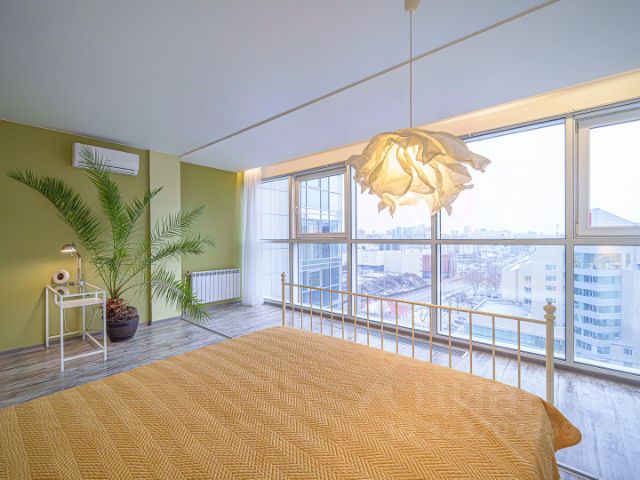 • Мастер-спальня (19 кв.м) + лоджия: Большая кровать 180x200, прикроватные тумбы, шкаф, 2 комода, стол письменный, стул, кондиционер, панорамное остекление.