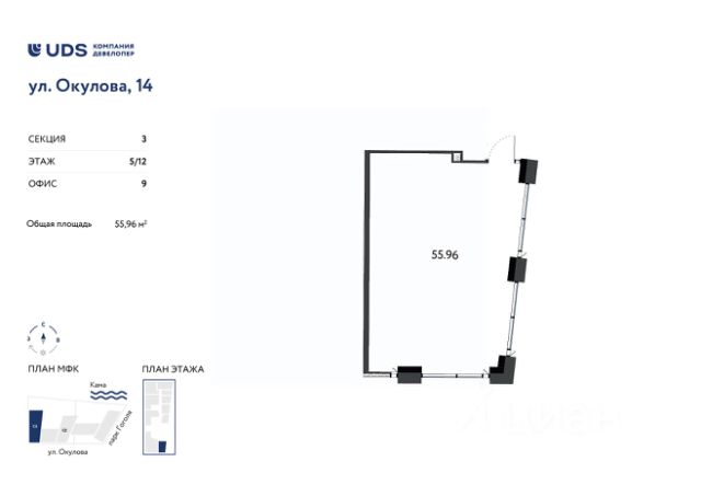 Помещение под офиc 55 м2 на 5 этажe МФК Окулова 14 от UDS.