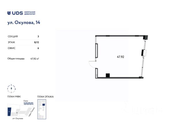 Помещение под офиc 48 м2 на 5 этажe МФК Окулова 14 от UDS.