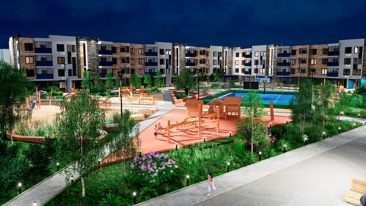 9-этажный жилой дом в Свердловском районе г. Перми. Благоустройство прилегающей территории включает в себя организацию детской и спортивной площадок, зоны отдыха и озеленение. Предусмотрены открытые гостевые автомобильные стоянки.