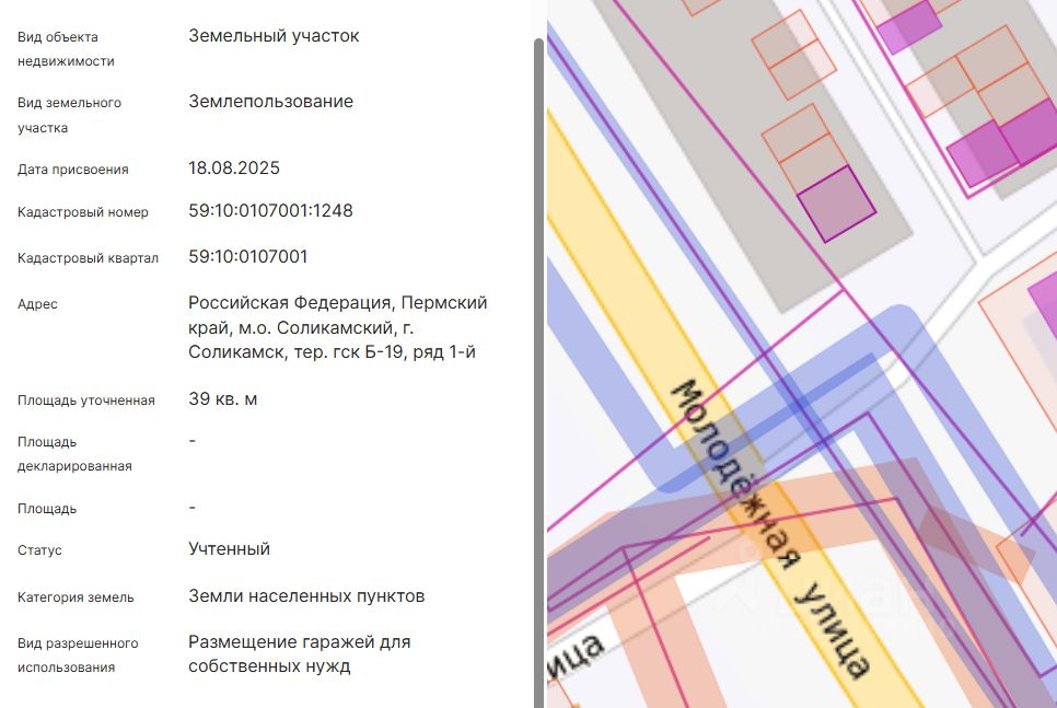Электронный аукцион на право заключения договора аренды земельного участка, расположенного на землях населенных пунктов, по адресу: Российская Федерация, Пермский край, м.о. Соликамский, г. Соликамск, тер. гск Б-19, ряд 1-й, с кадастровым номером 59:10:0107001:1248, площадью 39 кв.м, с видом разрешенного использования: размещение гаражей для собственных нужд