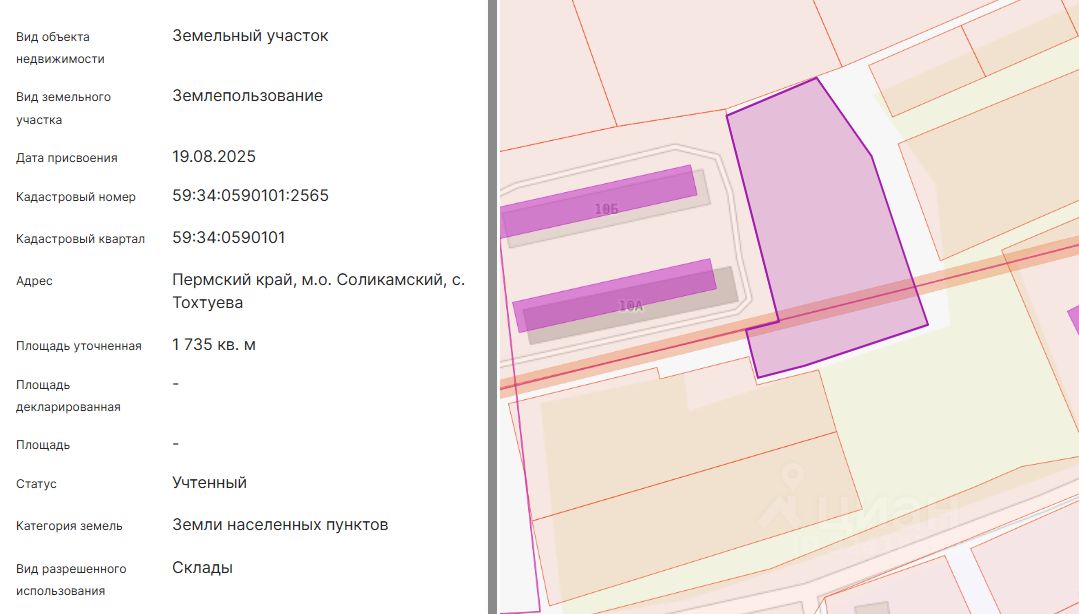 Электронный аукцион на право заключения договора аренды земельного участка, расположенного на землях населенных пунктов, по адресу: Пермский край, м.о. Соликамский, с. Тохтуева, с кадастровым номером 59:34:0590101:2565, площадью 1735 кв.м, с видом разрешенного использования: склады