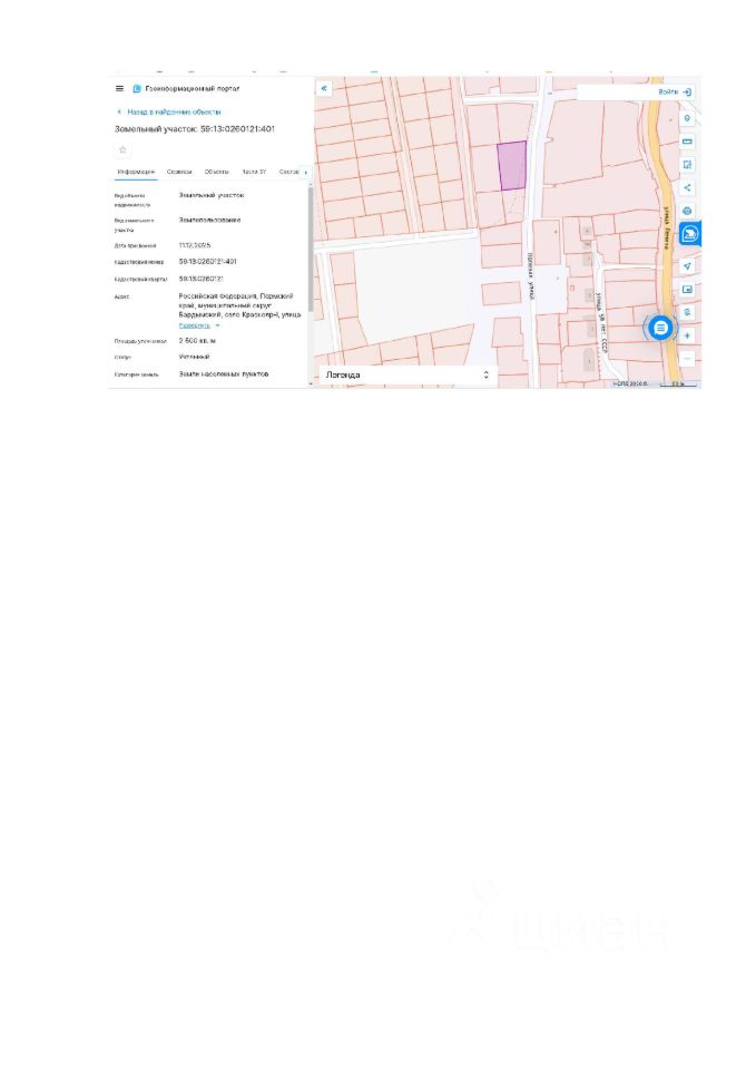 Российская Федерация, Пермский край, муниципальный округ Бардымский, село Краснояр-I, улица Гагарина, з/у 22, кадастровый номер 59:13:0260121:401, общая площадь 2500 кв.м., из земель населенных пунктов, вид разрешенного использования "Для ведения личного подсобного хозяйства (приусадебный земельный участок)"