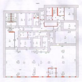 Первый этаж: площадь 645 кв.м с двумя выходами на улицу и шестью большими окнами, залы, кабинеты, вспомогательные помещения, санузлы.