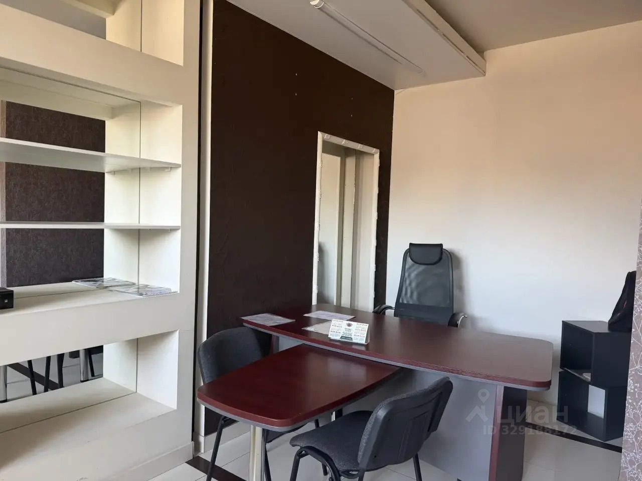 Внутри есть отдельный кабинет руководителя (можно разместить двух человек), зона ресепшен и открытое пространство ещё на пять мест. Итого можно разместить до девяти сотрудников.