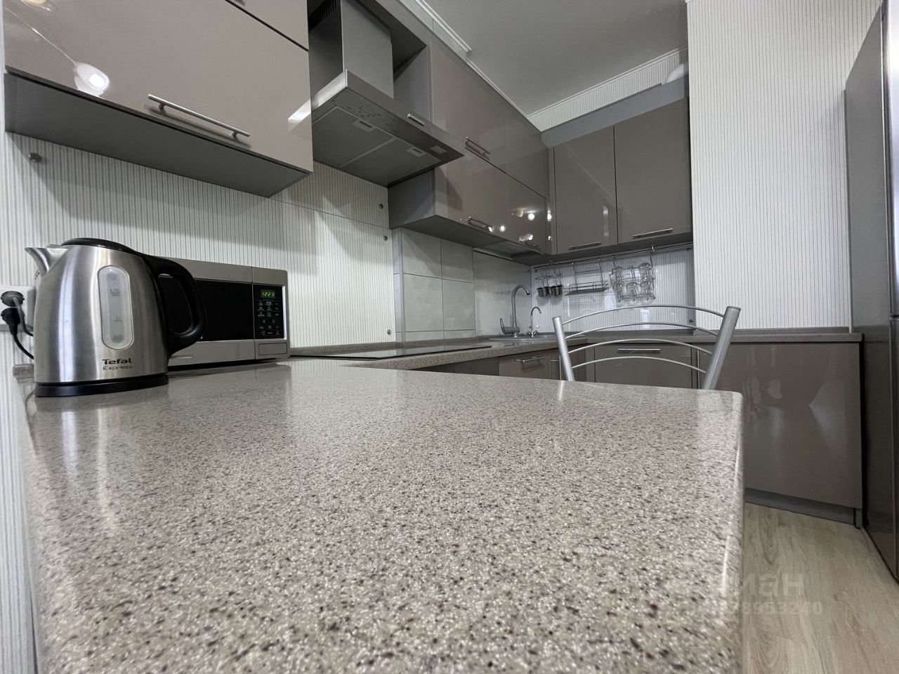В кухне-гостиной установлен кухонный гарнитур с разделочной поверхностью из искусственного камня, а также имеется расширенное двухстворчатое окно с видом на панораму города Перми с высоты 21-го этажа, окна на закат в сторону реки Камы.
