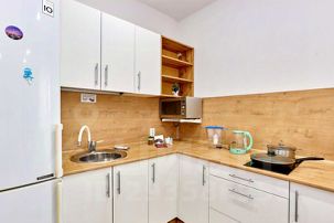 В квартире есть всё необходимое: шампунь, жидкое мыло, стиральный порошок, туалетная бумага, чай, кофе, сахар.