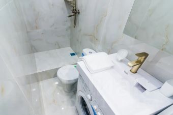 Стиральная машинка, фен, утюг, сушилка, гладильная доска, комплекты свежего постельного белья, полотенца, тапочки и предметы гигиены