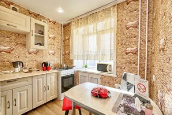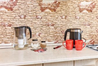 Кухня оснащена холодильником, плитой с духовкой, вытяжкой, микроволновой печью, чайником, фильтром для воды, посудой и приборами.