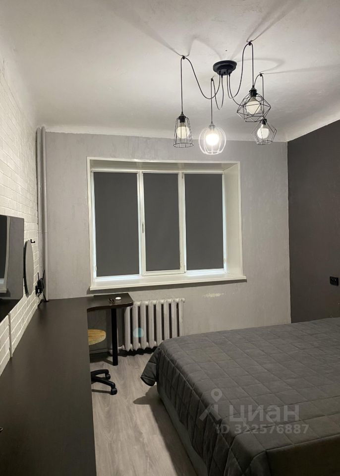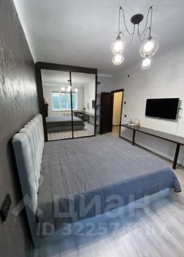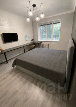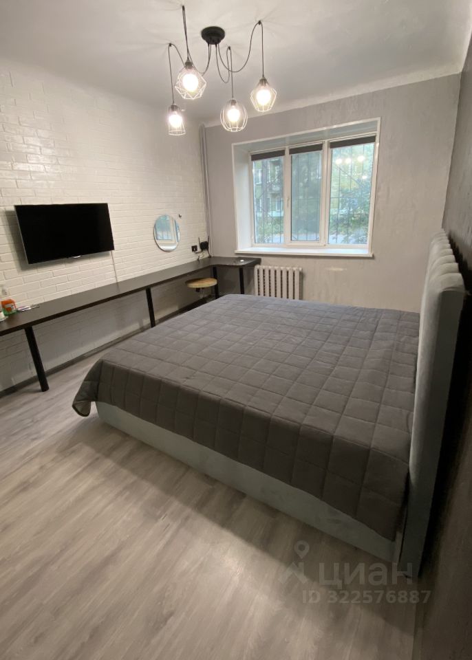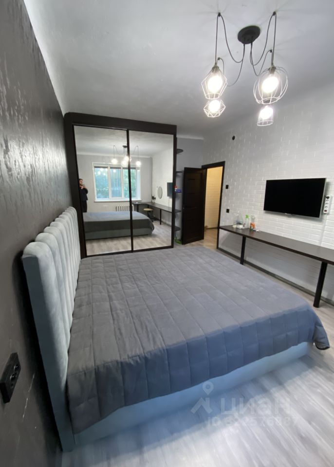 • Первая комната (спальня): Уютная спальня с большой двуспальной кроватью. Вдоль стены установлен длинный стол, который можно использовать как рабочее место или туалетный столик (есть зеркало). Шкаф-купе с зеркальными дверями визуально расширяет пространство и позволяет хранить все необходимое. Есть телевизор. Рулонные шторы "блек-аут".