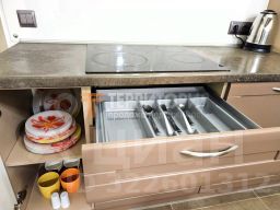 Кухня/гостиная встроенная кухонная мебель, обеденная группа, диван, бытовая техника (варочная поверхность, духовой шкаф, вытяжка, СВЧ, 2-камерный холодильник, питьевой фильтр с накопительным баком, электрочайник, водонагреватель проточного типа, ТВ, кондиционер).