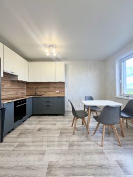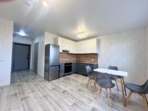 - Современная кухня с гарнитуром, обеденным столом на четыре персоны, индукционной плитой, духовым шкафом, вытяжкой и холодильником.