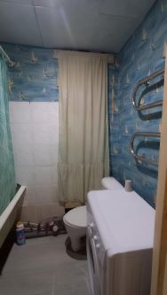 В квартире сделан косметический ремонт. Комната светлая и просторная, в ней есть необходимая мебель . Кухня площадью 6 кв. м оборудована мебелью ,есть холодильник и стиральная машина. Санузел совмещенный, есть ванна. Окна выходят во двор.