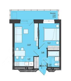 Площадь - 35 кв.м., есть большая светлая застекленная лоджия.