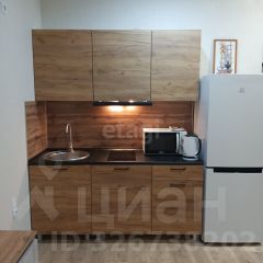 Имеется кухонная зона с гарнитуром, индукционной варочной поверхностью, вытяжкой, холодильником, микроволновкой и чайником.