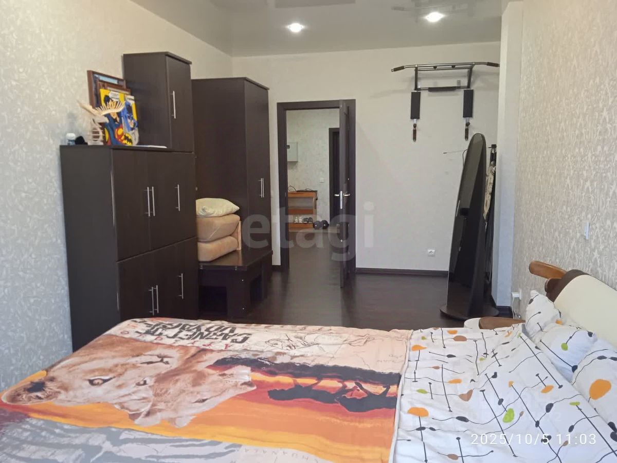 В спальне установлена двуспальная кровать 180x200, шкаф для одежды, телевизор со Smart TV, а также предусмотрены системы для поддержания порядка, такие как робот-пылесос и гладильная доска.