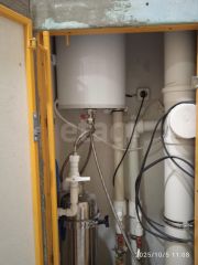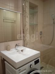Совмещенный санузел включает душевую кабину, стиральную машину, водонагреватель и систему теплого пола, обеспечивая бытовой комфорт в любое время года.