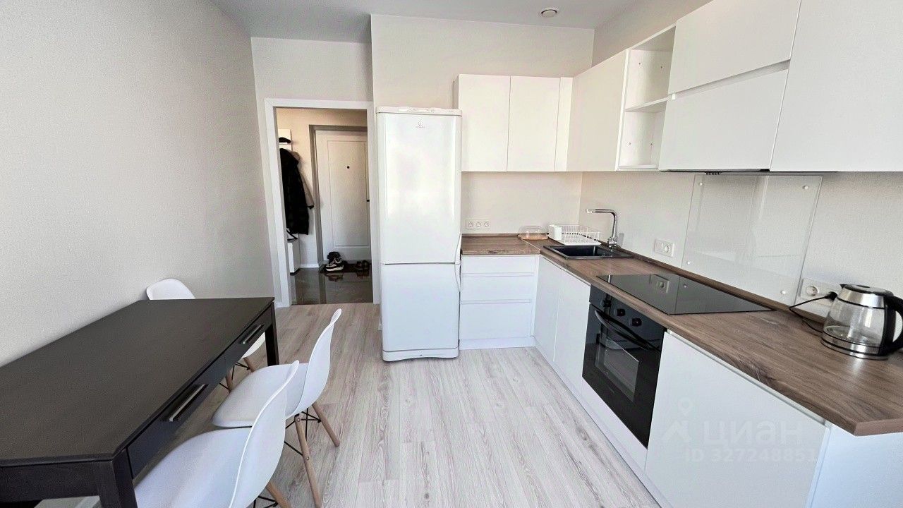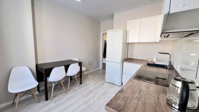 Квартира оснащена всей необходимой мебелью и бытовой техникой, включая диван, тумбу под телевизор, холодильник, стиральную машину, функциональный кухонный гарнитур с варочной поверхностью, духовым шкафом, вытяжкой и электрическим чайником. Пространство организовано таким образом, чтобы обеспечить максимальный комфорт и удобство для проживания.