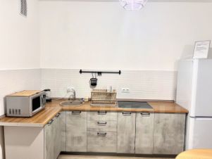 - Кухня - индукционная плита, вся необходимая посуда, микроволновая печь, чайник.