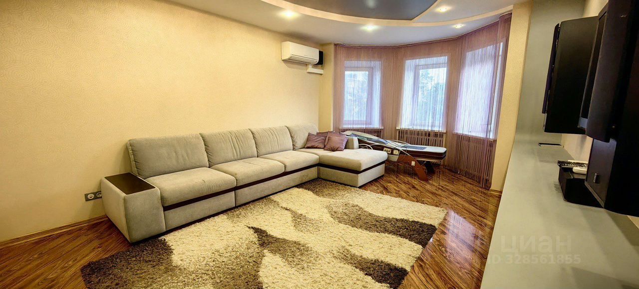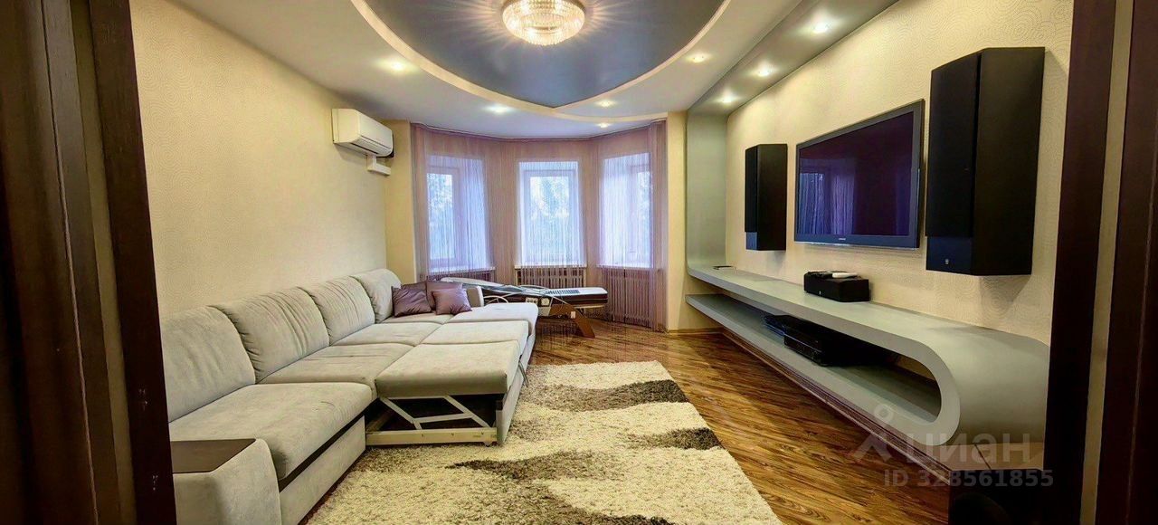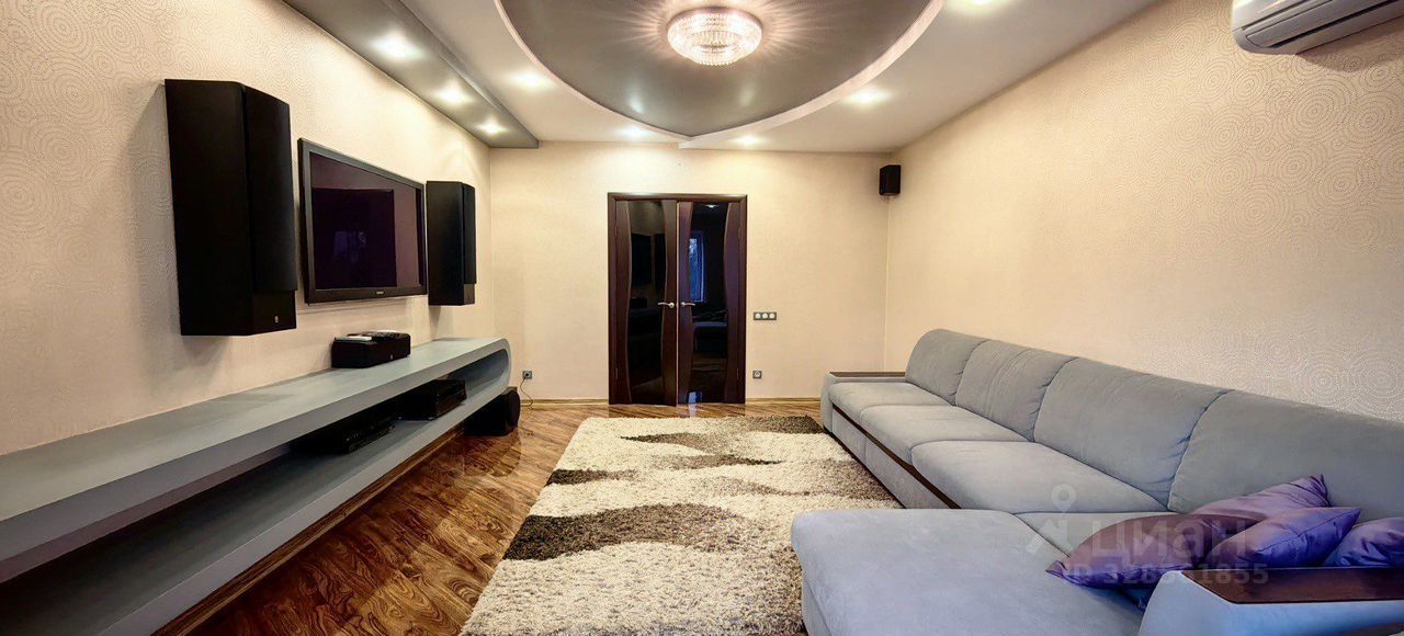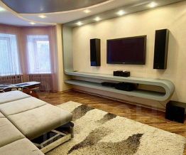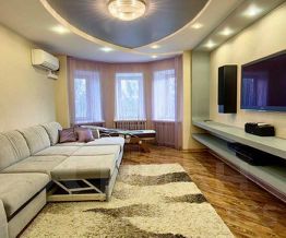 Гостиная в стиле НighТес. 4-х метровый диван с атаманкой и подставками для напитков, раскладывается в полноценную двуспальную кровать 140*200. Большая плазменная панель, проигрыватель Вlu Rаy, караоке, домашний кинотеатр 6:1 Yаmаhа, дизайн-Радиаторы.