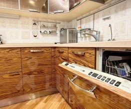 Большая кухня 14кв. м. с отдельной утепленной лоджией. Имеется много разнообразной посуды, столовых предметов, контейнеров для хранения еды, также имеются бокалы для различных напитков. Бытовая техника премиум качества.
