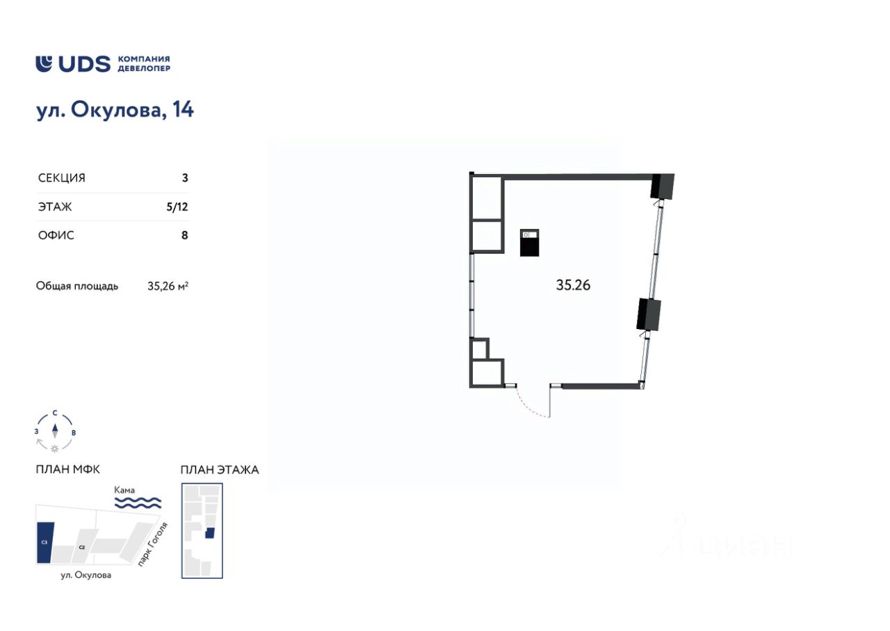 Помещение под офиc 35 м2 на 5 этажe МФК Окулова 14 от UDS.