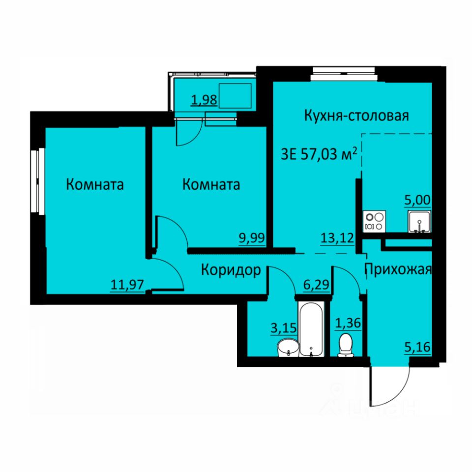Общая площадь57,05 м²