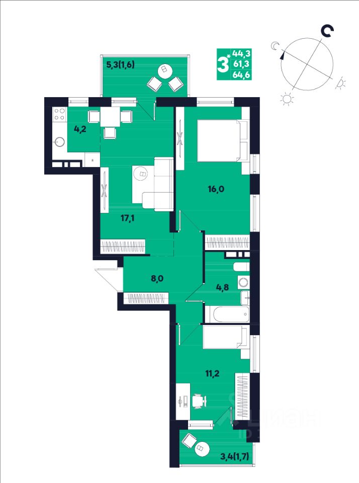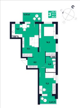 44,3 м²