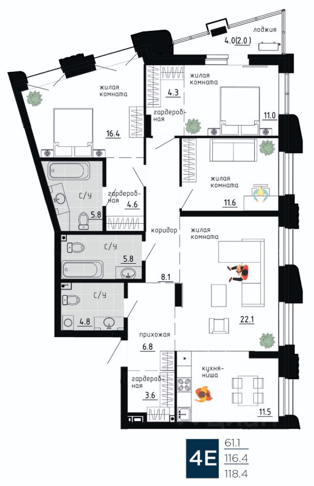 В доме представлены уникальные форматы квартир с: