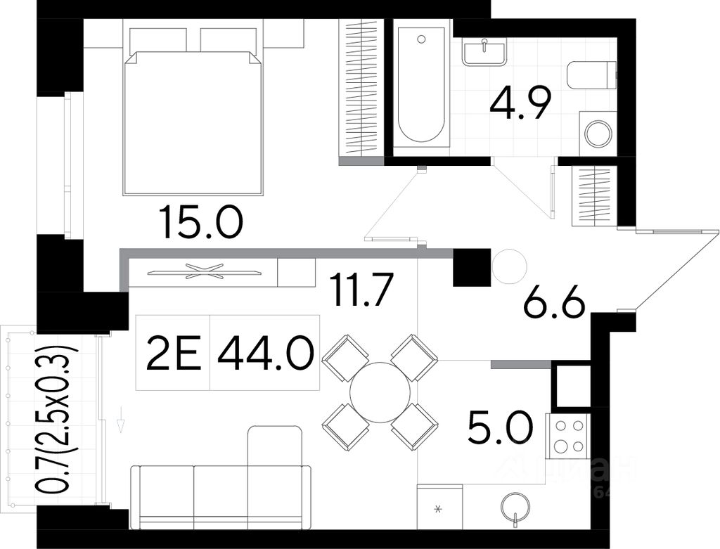 Красивый сценарий жизни в квартире открытой планировки* площадью 45.2м2 в клубном доме Строганов на Пермской 86. *Резиденты могут воспользоваться готовыми планировочными решениями организации пространства.