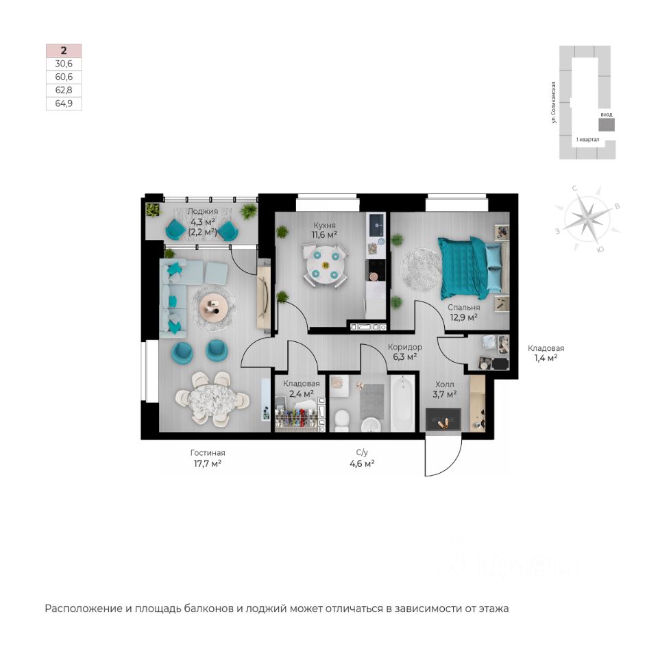 64,9 м²