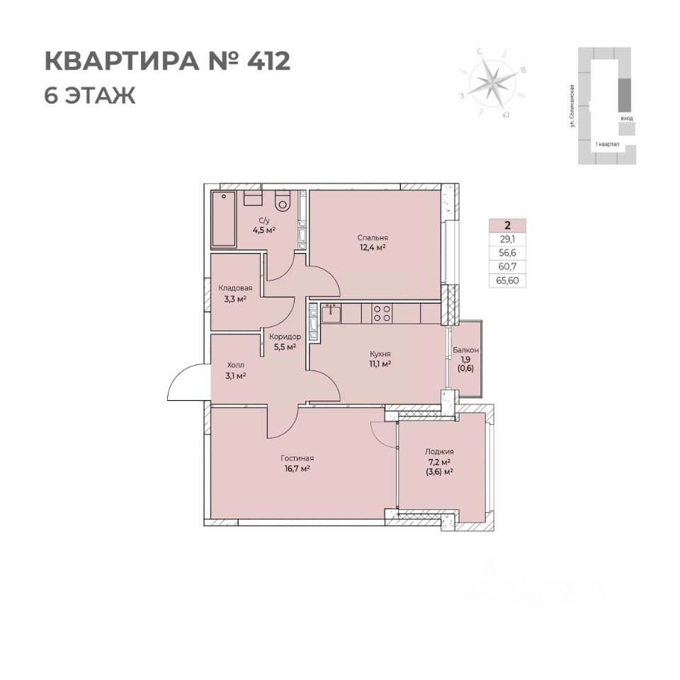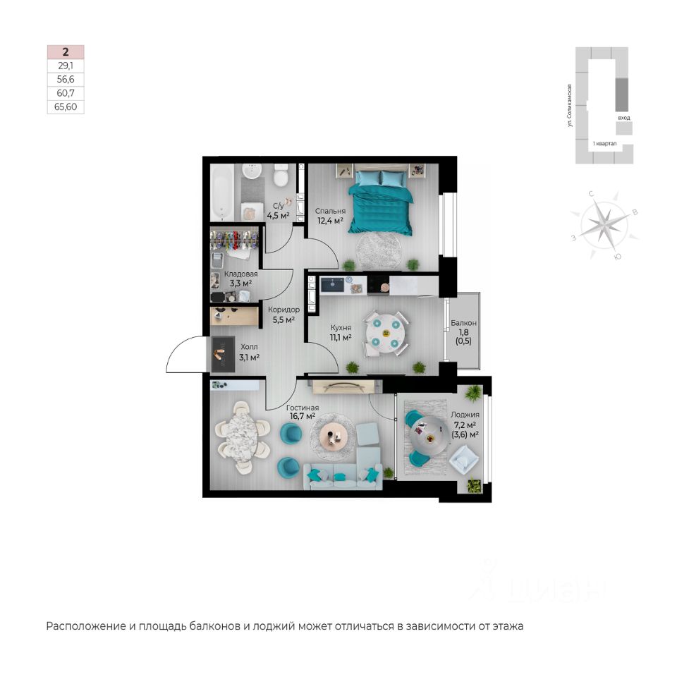 1 лоджия, 1 балкон